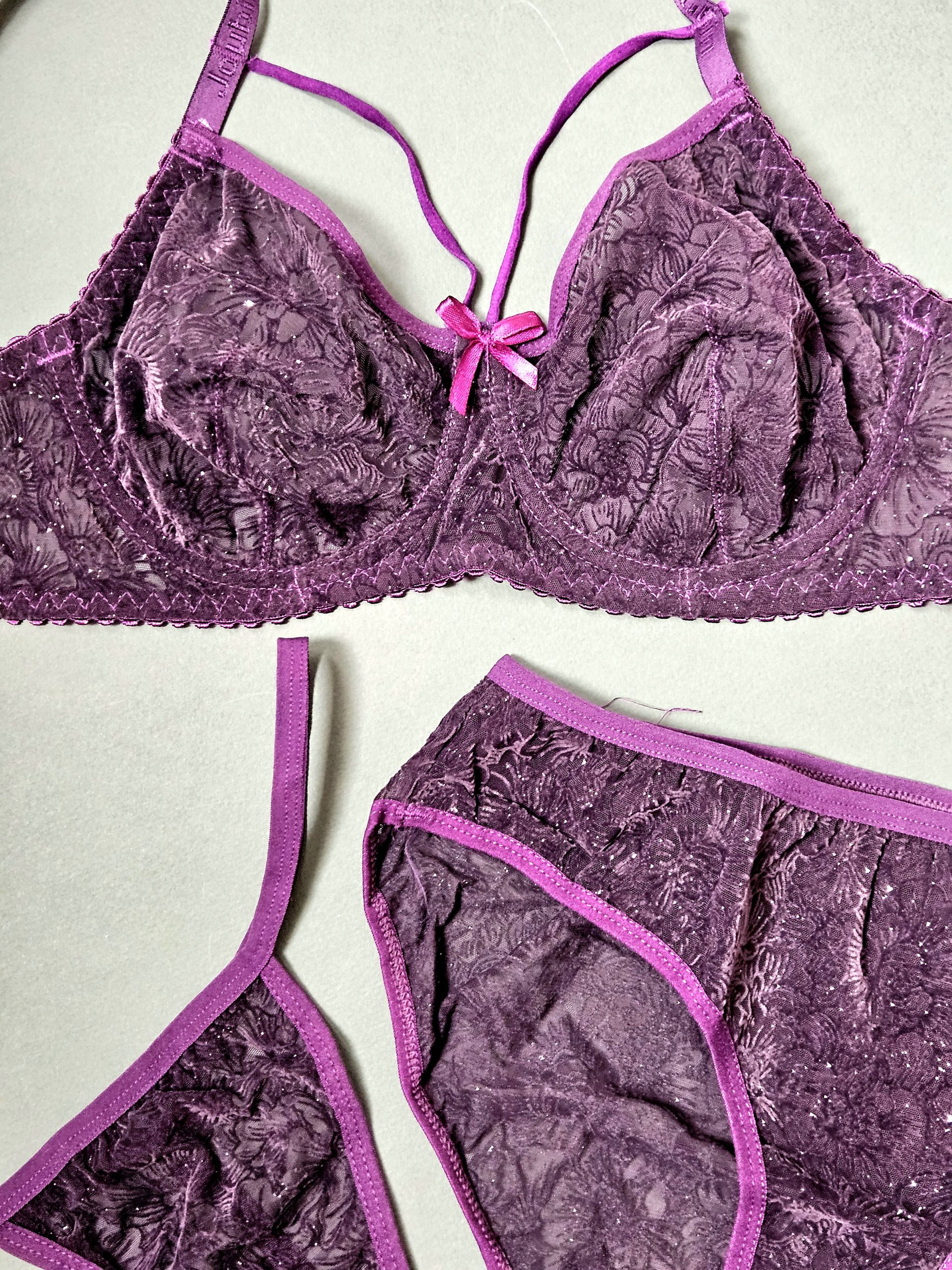 ست سه تیکه شورت و سوتین تور مخمل برند ژوبین مدل کهکشان مخملی