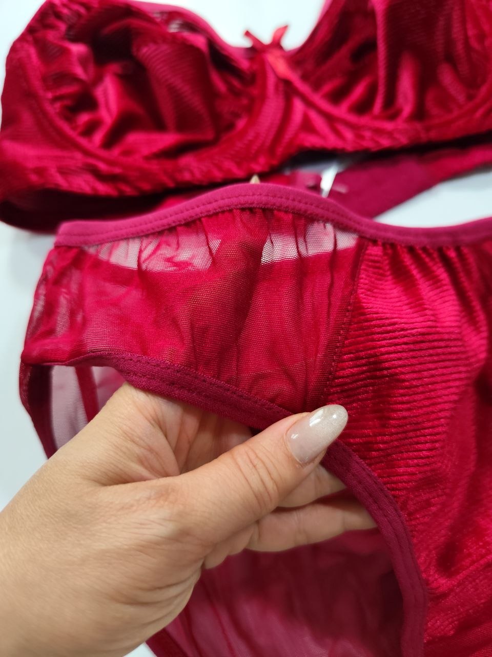 شورت این ست از نوع اسلیپ پشت توری است که با ترکیب ظرافت و راحتی ساخته شده. قسمت جلوی شورت از مخمل براق استفاده شده که جلوه‌ای لوکس ایجاد می‌کند و پشت شورت توری است تا علاوه بر زیبایی، سبکی و نرمی بیشتری به همراه داشته باشد. این طراحی باعث شده مدل نیلی برای استفاده روزانه، مهمانی و حتی زیر لباس‌های جذب گزینه‌ای عالی باشد.