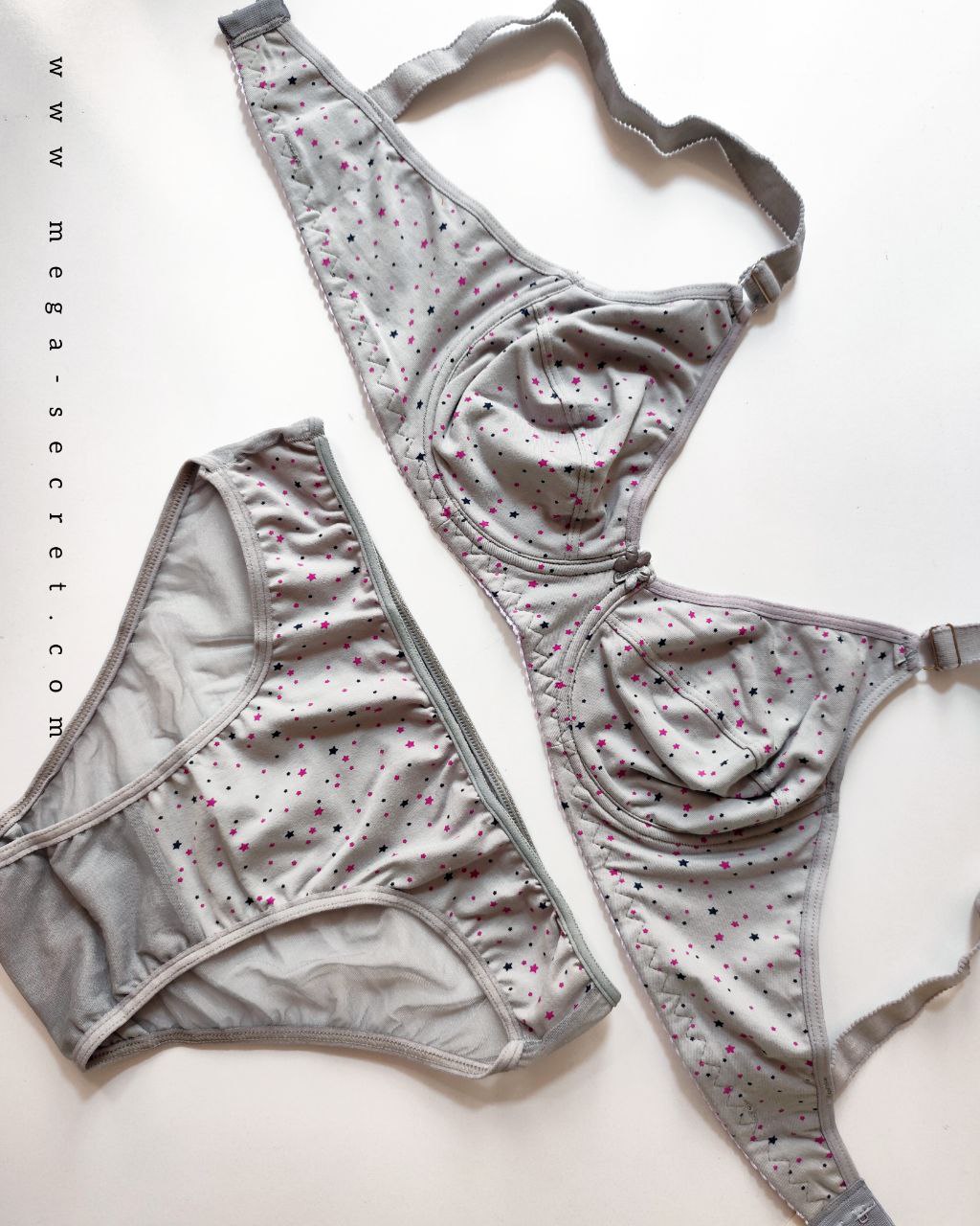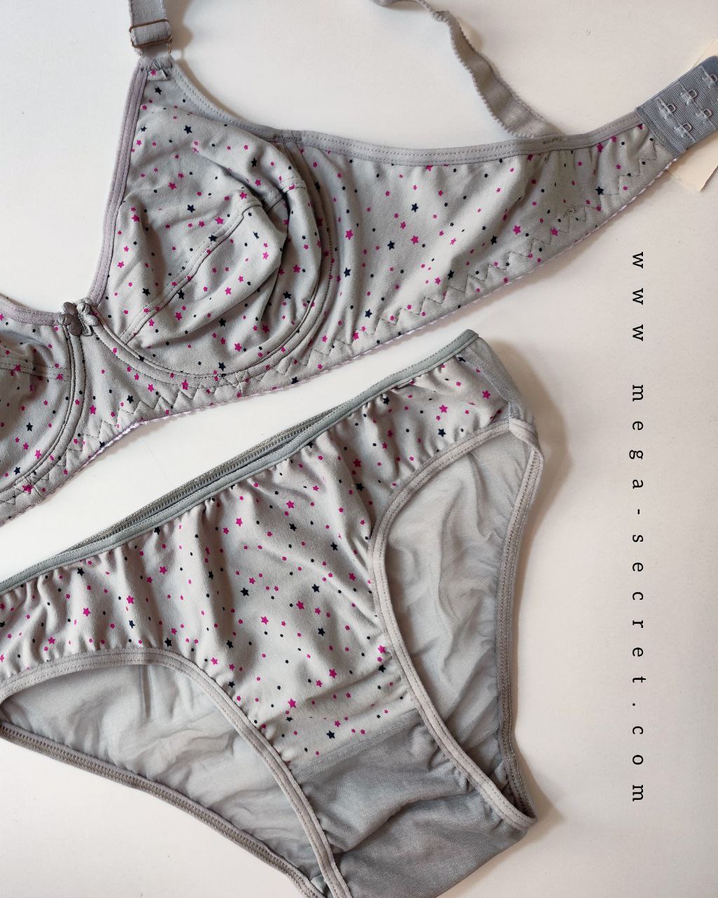ست لباس زیر نخی مدل ستارههای کهکشانی، ترکیبی از راحتی و طراحی فانتزی است. سوتین طوسی رنگ با طرح ستارههای کهکشانی، حالوهوای دخترانه و خاصی به این مدل داده است. پارچه نخی سوتین با لایه داخلی لطیف، مناسب پوستهای حساس بوده و بهخوبی رطوبت را جذب میکند. این طراحی برای استفاده روزمره و فصلهای گرم سال بسیار مناسب است.