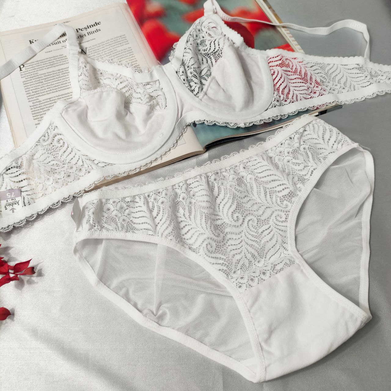 سوتین این ست از نوع بدون اسفنج و فنردار است، به‌گونه‌ای که فرم سینه را به‌صورت طبیعی حفظ کرده و هم‌زمان جلوه‌ای زیبا و زنانه ایجاد می‌کند. گیپور با کیفیت بالا، ظریف و لطیف است و طراحی نیمه‌شفاف آن، نمایی جذاب و دل‌نشین دارد. بندهای قابل تنظیم و قزن پشت، امکان فیت شدن بهتر با بدن را فراهم می‌آورد.